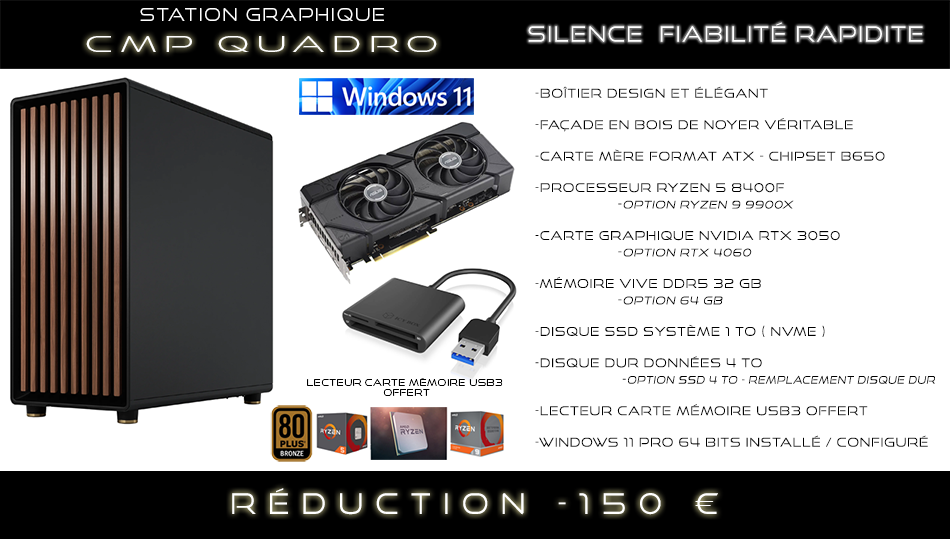 L'informatique est en perpétuelle évolution et il est bien difficile de faire des choix perspicaces quand vient le temps de renouveler son unité centrale. Si certaines avancées sont très utiles d'autres le sont beaucoup moins et se payent au prix fort. La station graphique CMP Quadro est parfaitement adaptées aux logiciels professionnels comme Photoshop, Lightroom, DxO Optics Pro ou encore Capture One. Cette unité centrale tourne sous Windows 11 64 bits Pro et est donc tout à fait utilisable comme ordinateur principal dans le cas d'un usage amateur.