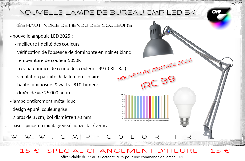 Le changement d'heure d'hiver implique de travailler plus souvent devant son écran alors que la nuit tombe. Avoir une source lumineuse de qualité ( lumière du jour et haut indice de rendu des couleurs ) à proximité de son espace de travail permet d'avoir une cohérence entre la température de couleur de votre écran et celle de la pièce où vous travaillez. Cela peut paraître superflu mais il n'en est rien, c'est important et apporte un comfort appréciable. De plus si vous faites du tirage, une telle source lumineuse est quasi obligatoire si vous ne voulez pas avoir de mauvaises surprises le lendemain: la lampe CMP et son indice de rendu des couleurs de 99 ( IRC ) vous permet d'apprécier les couleurs de vos tirages de la même façon que si vous étiez en plein jour !