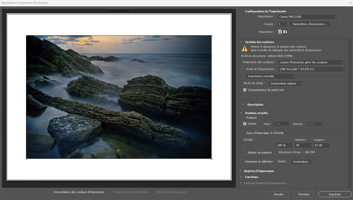 L'utilisation des profils est simple, les tirages seront effectuez en reprenant exactement la même configuration du driver de l'imprimante que lorsque vous avez imprimé les mires. Dans tous les cas, la gestion de la couleur doit être désactivée dans le driver de l'imprimante, c'est photoshop qui gère la gestion de la couleur, pas le driver de votre imprimante!