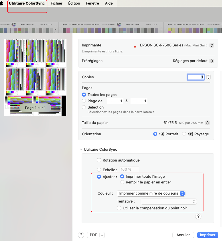 Vérifiez ensuite la mise en page de l'impression en cliquant sur "Print Setup" . Choisissez votre imprimante et cliquez ensuite sur " Propriétés " afin d'accéder au pilote de l'imprimante et choisissez les paramètres en fonction du papier utilisé. Attention cette opération est importante et vous devez mémoriser exactement tous les paramètres car ils devront être rappelés lors de l'utilisation des profils d'impression ( voir ici pour paramètrer votre pilote correctement ). Quand cette configuration est effectuée vous pouvez sortir du driver de l'imprimante et cliquer sur " ok " afin de lancer l'impression de la mire. Attention utilisateurs de Mac: -tout d'abord, vérifiez que vous avez bien installé le driver complet de votre imprimante ( version de pilote souvent nommée XXX series 2, qui permet d'avoir toutes les options disponibles ( colorsync, large choix de papiers et les options avancées ). Lors de l'impression des mires à l'aide de l'utilitaire Adobe, le choix " colorsync " est grisé: c'est