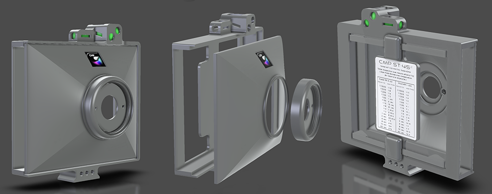 Le boîtier CMP ST-45 mesure 16.5 x 16 x 7cm et pèse 275 grs, donc très compact et très léger. Il accepte les chassis au format 4x5 inch ( Fidelity, Lisco et bien d'autres ) et un fixation trépied au format Arca Swiss Classic est intégrée au boîtier. Ce type de liaison appareil - trépied particulièrement fiable est devenu un standard dans le monde professionnel. Un adaptateur est disponible en option pour les trépieds utilisant le pas Kodak standard.