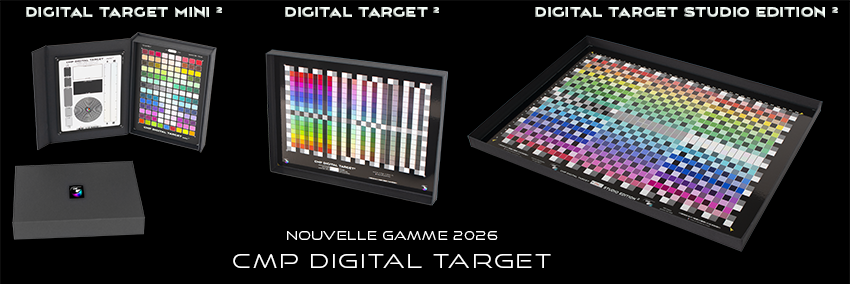 La Digital Target Studio Edition ² est une mire de calibrage pour APN, disponible sur un nouveau support sans azurant optique brillant et d'une taille de 31x42cm. La nouvelle distribution de l'échantillonnage des couleurs se fait tous les 15°, sur 3 niveaux de saturation et sur une gamme très large, avec une Dmax élévée et des couleurs saturées encore jamais vues sur des mires de calibrage ! Sur le pourtour de la mire, un damiers noir/gris/blanc permet aux logiciels d'évaluer l'uniformité de l'éclairement de la mire et d'en tenir compte pour le calcul des profils. La Digital Target Studio Edition ² est constituée de 988 plages colorées de grande taille, ce qui facilite son utilisation et permet la création de profils ICC pour toute application compatible ( DxO, Capture One ... ) mais aussi de profils DCP utilisables directement dans Camera Raw et Lightroom. Du fait de sa surface brillante, la prise de vue de la Digital target Studio Edition ² est plus délicate qu'une mire à la surface mate, mais cet inconvéniant est gérable et minime au vu de la qualité des profils obtenus. |