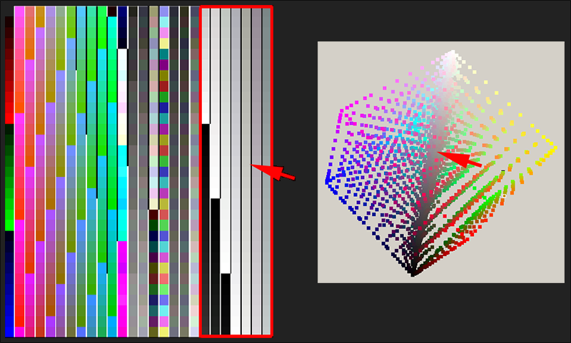 Les plages autour de l'axe des gris sont extrêmement importantes car elles caractérisent une gamme de teintes sensibles: la gamme de gris. Votre imprimante est alors utilisée de façon optimale: toutes les couleurs imprimables ( GAMUT ) sont définies, mesurées. Les dégradés beaucoup plus réguliers et sans cassures de tons ( que l'on rencontre souvent dans les ombres ). Le grand intéret de ces profils sur-mesure réside aussi dans le fait qu'il est extrêmement difficile d'obtenir de beaux tirages noir et blanc avec une imprimante couleur. La dérive de couleur n'étant pas linéaire, il est impossible d'appliquer des corrections manuelles afin d'obtenir une tirage neutre. Si on considère l'économie de papier, d'encre, de temps et la qualité des tirages, ces profils sont très vite rentabilisés!