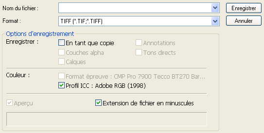 En couleur comme en noir et blanc, n'oubliez pas de choisir un espace couleur de travail ( profil ICC ) adapté à votre flux de travail: les espaces adobe 98 ou Beta RGB ( téléchargeable si vous ne l'avez pas ) sont parfaits pour les fichiers RVB ( couleur ), l'espace gray gamma 2.2 est adapté aux fichiers en niveau de gris ( noir et blanc). N'oubliez pas d'encapsuler votre espace de travail à votre fichier lors de l'enregistrement, c'est primordial pour que le moteur de gestion des couleurs puisse fonctionner correctement lors d'une utilisation de vos images. Imaginons que je reçoive vos images pour des tirages et que vos fichiers ne comportent pas d'espace couleur: je ne peux savoir dans quel espace vous avez travaillé, par conséquent les résultats seront imprévisibles ... ( en général quand un tel cas se présente je vous contacte pour connaître l'espace couleur original du fichier, puis je l'assigne manuellement à votre fichier ).