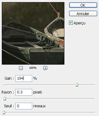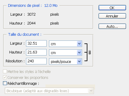 des images, je vous conseille de travailler vos images en les laissant à leur résolution originale et de les sauver telles que, avec une légère accentuation pour compenser la perte de netteté due au filtre anti-aliasing du capteur ( réglage d'accentuation type : gain 150, rayon 0.3 ). Vous pouvez indiquer la taille d'impression future sans pour autant interpoler le fichier, dans la fenêtre taille d'image ( menu / image / taille d'image ) ne cochez pas " Rééchantillonnage "